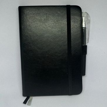 This 5 3/4" x 4" notebook includes lined pages with two ribbon page markers and one pen.
