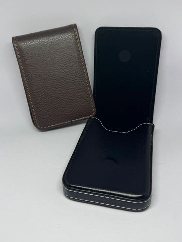 This business card holder includes a top side, flip open cover with magnetic closing. Available in: Black & Dark Brown